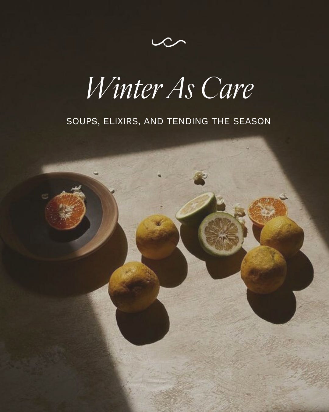 Winter light held low by candle flame. Early darkness gathering around the table. A spoon against a ceramic mug, broth simmering nearby. Wool socks on cool floors. Hands near the stove. Citrus peels opened slowly. Fresh eucalyptus cut and placed in water. Outside, the world quieter than usual. Lentils and grains cooked slow, bread torn by hand. Music low beneath conversation. Beds holding warmth longer than expected. Time stretching, unhurried.